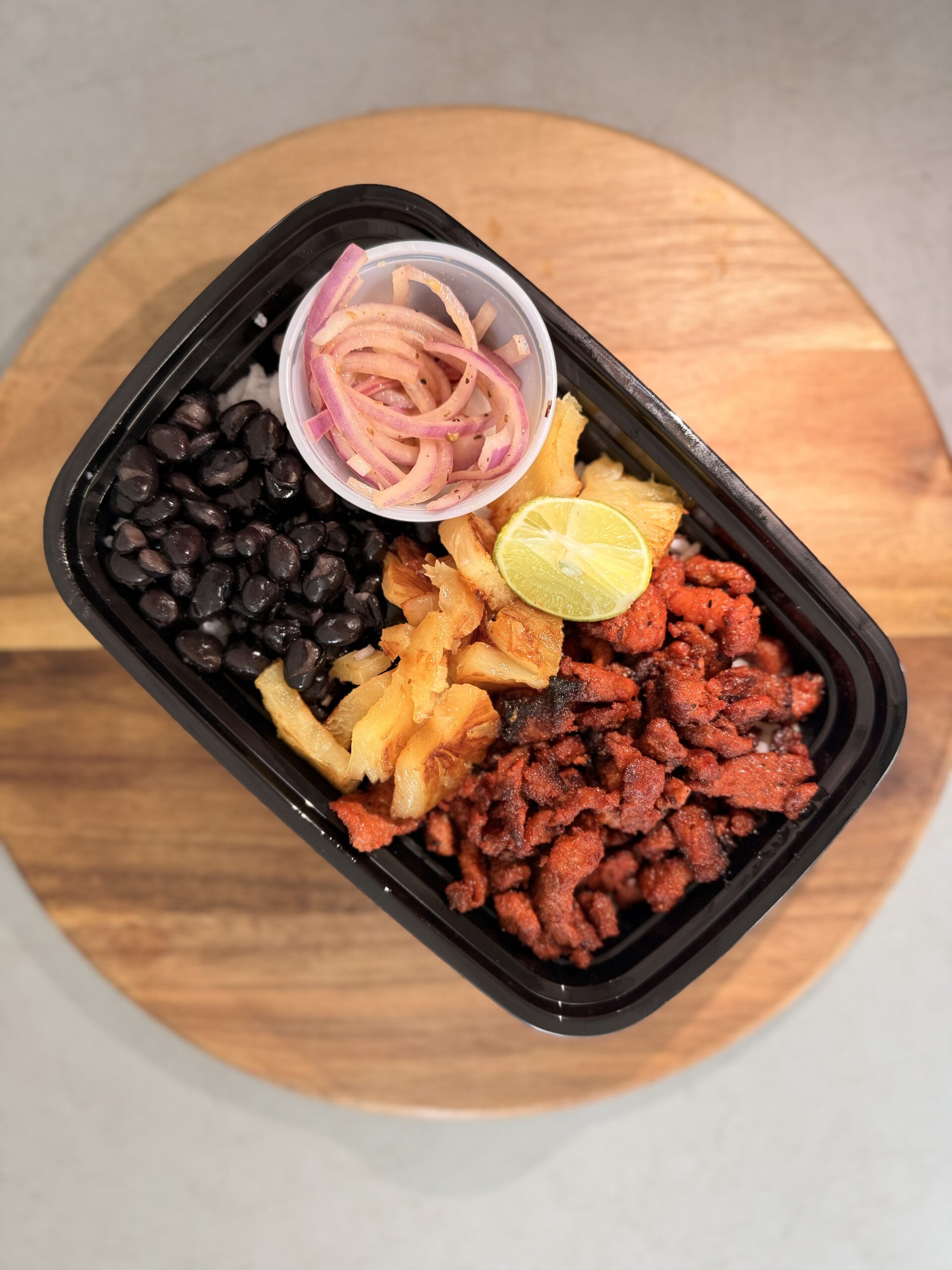 Our El Pastor Plate brings the perfect balance of bold flavor and clean nutrition. Tender al pastor meat is seasoned, marinated, and cooked until it melts with every bite. It sits on a warm bed of rice and is paired with hearty black beans, fresh red habanero onion, and sweet pineapple that brightens the entire plate. Every element works together to create a meal that feels both comforting and vibrant. It is satisfying, full of flavor, and crafted to fuel your day with the quality ingredients your body deserves.