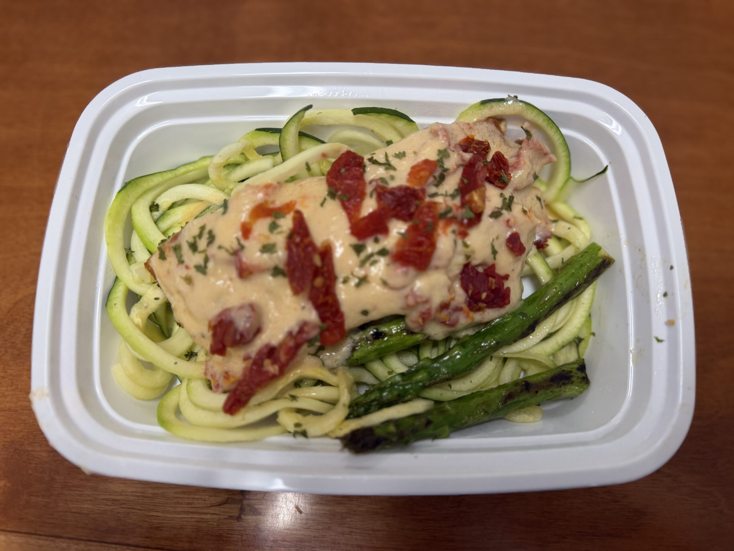 Fall in love with a lighter twist on our classic Marry Me Pasta. Flaky seasoned salmon, fresh zucchini noodles, and tender broccoli come together in a rich, velvety Alfredo sauce with the bright pop of sun-dried tomatoes. Each forkful blends buttery salmon, roasted garlic, cracked black pepper, and a touch of Parmesan for a perfectly balanced dish that’s creamy, satisfying, and low-carb without sacrificing flavor. It’s fresh, indulgent, and the perfect choice when you want something delicious and still feel light and energized afterward.